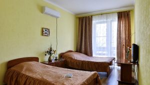 В номере: две односпальные кровати, шкаф для одежды, прикроватные тумбочки, журнальный столик, балкон, беспроводной интернет, телевизор, сплит-система. В ванной комнате: душевая кабина, умывальник. Площадь: